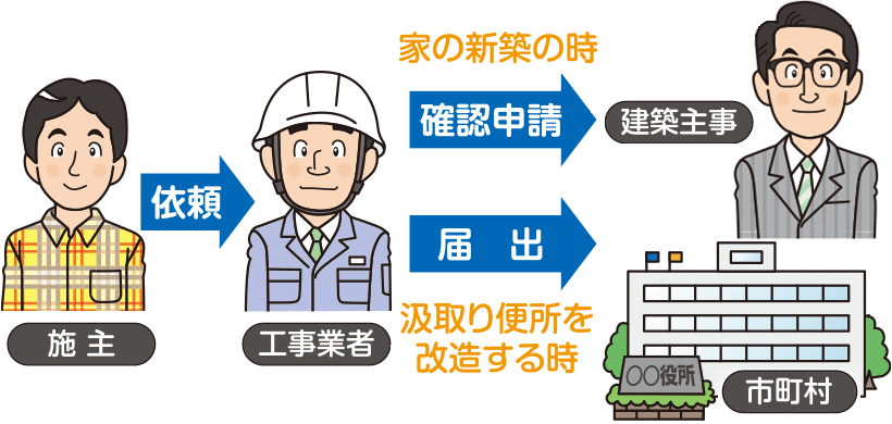 新築の場合は「建築確認申請書」に「浄化槽設置届出書」を添付して,特定行政庁もしくは指定確認検査機関に申請します。